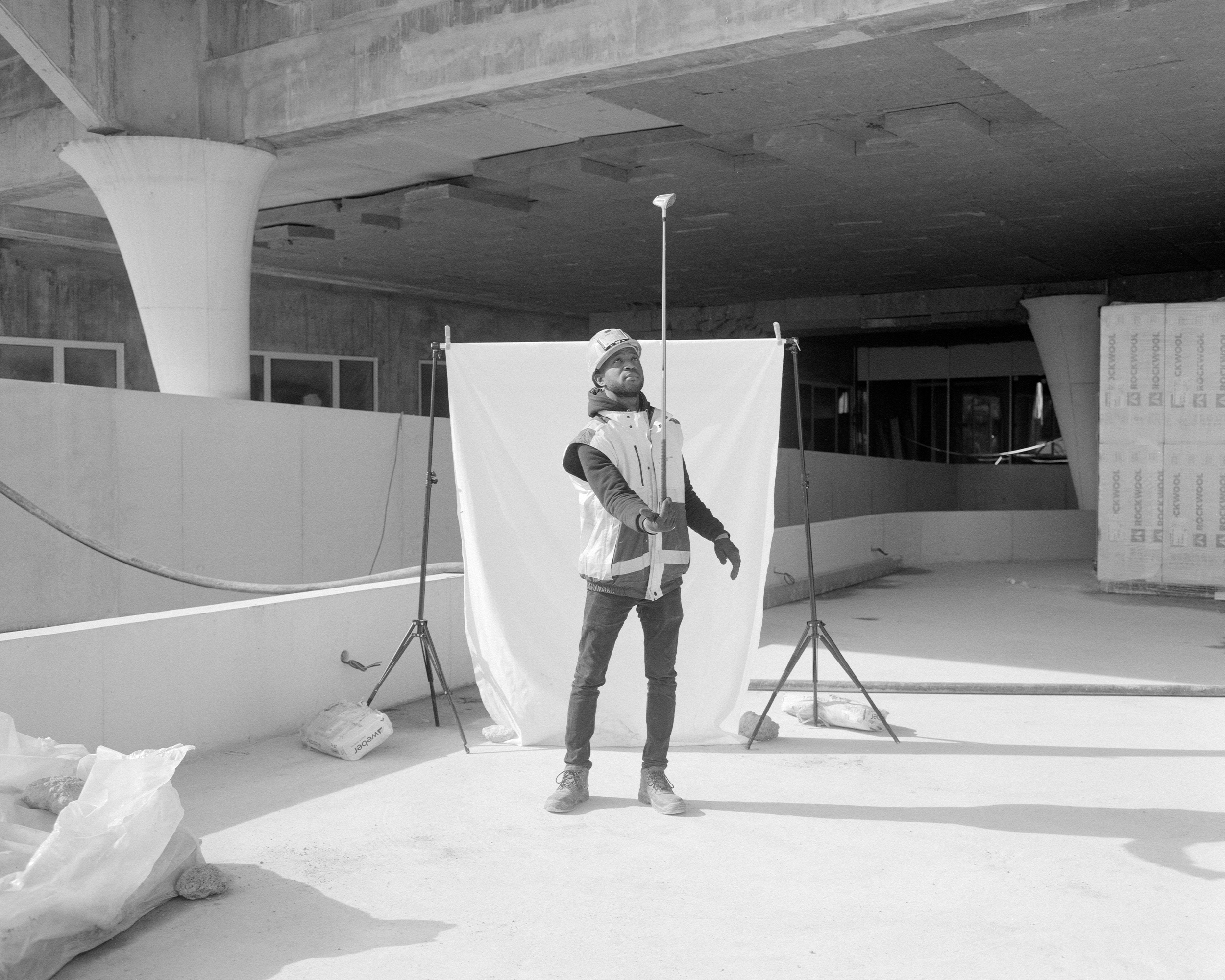 Based on this idea of creating a new vision of the Olympic Games, we carried out an artistic project in collaboration with construction workers from the Olympic site PRISME in Seine-Saint-Denis. The collaboration resulted in a series of staged photographs of workers performing with different objects and accessories linked to Olympic sports. The project provides a critique of the invisiblization of the labor force behind the organization of mega sporting events as well as an invitation to think of sports from the perspective of gestures and body postures.